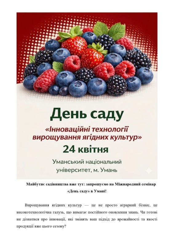 24 квітня 2026 року Уманський національний університет стає головним майданчиком для обміну досвідом між науковцями, провідними агрокомпаніями та практиками-виробничниками. Щорічний «День саду» — це живий діалог між виробниками, і тими, хто розробляє технології їхнього вирощування, захисту та живлення. Щороку захід збирає дедалі більше учасників, бо дає те, чого не знайдеш у підручниках: актуальні відповіді на реальні виклики сезону.