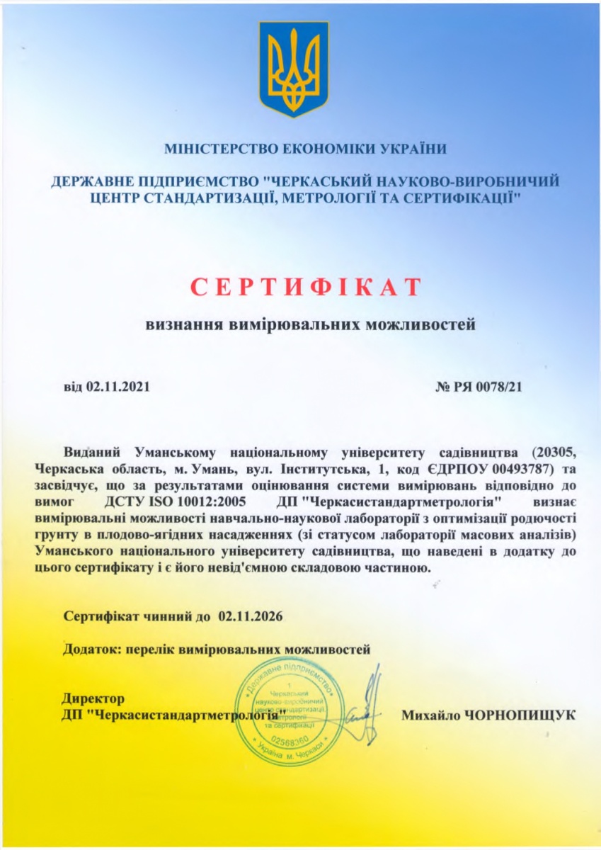 Навчально-наукова лабораторія сертифікована міністерством економіки України, державне підприємство "Черкаський науково-виробничий центр стандартизації, метрологіх та сертифікації". Сертифікат № РЯ 0078/21 від 02.11.2021